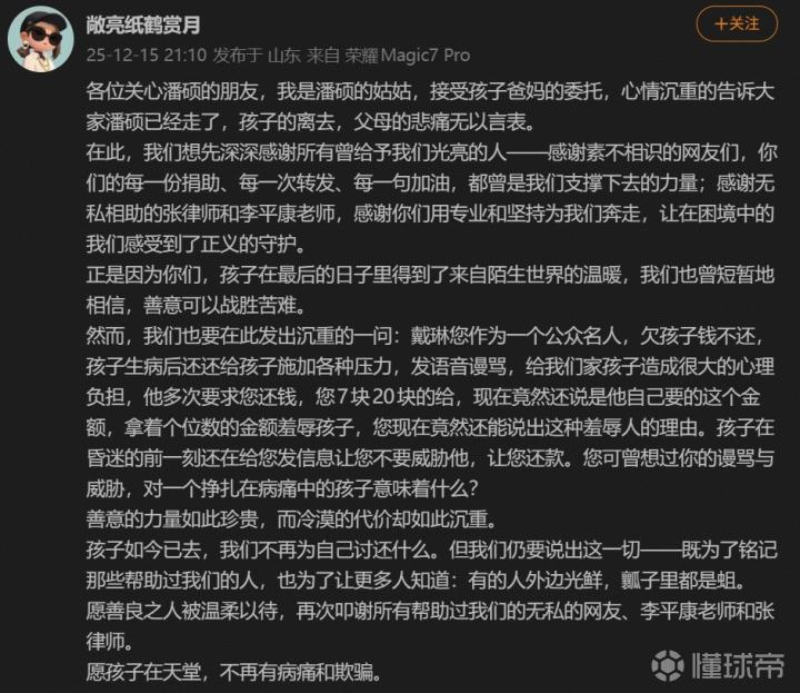 北京時間12月15日,山東球迷潘碩的姑姑在社交媒體發布信息,確認其侄子潘碩因病情惡化已不幸離世,此前潘碩曾被戴琳拖欠治療所需的救命款項。
